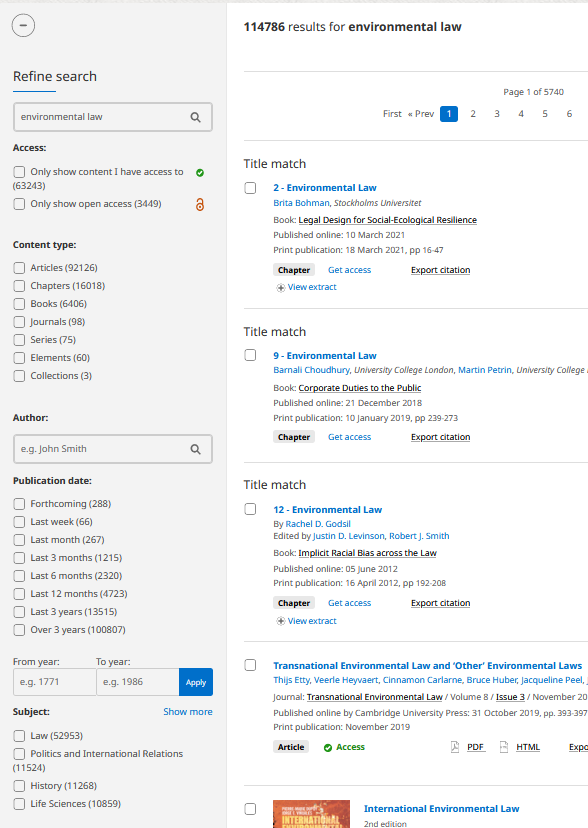 Depuis la page principale de Cambridge Core, il est possible d’effectuer une recherche par mots clés dans l’ensemble des fonds documentaires de la base. Un système de complétion automatique permet, en tapant les premières lettres d’un titre, d’afficher des propositions de revues ou d’ouvrages.