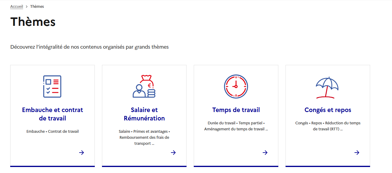 - Informations génériques organisées en thèmes et sous thèmes, souvent sous forme de questions-réponses issues du site service-public.gouv.fr