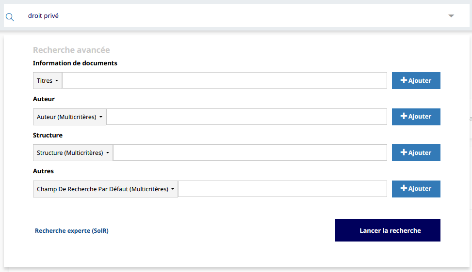 Le formulaire de recherche avancée est accessible depuis la liste de résultat d’une première requête. Il propose de très nombreux champs répartis en 4 catégories qu’il est possible de croiser :