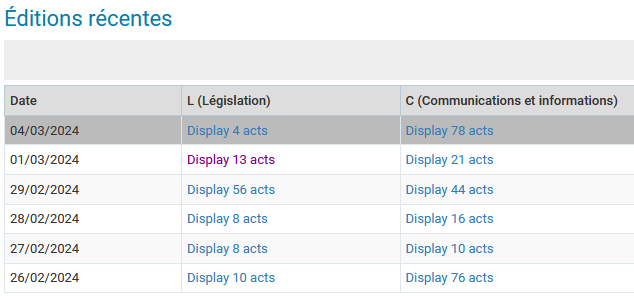 • Accès direct aux numéros récents : pour chaque série, mention du nombre d’actes publiés par jour