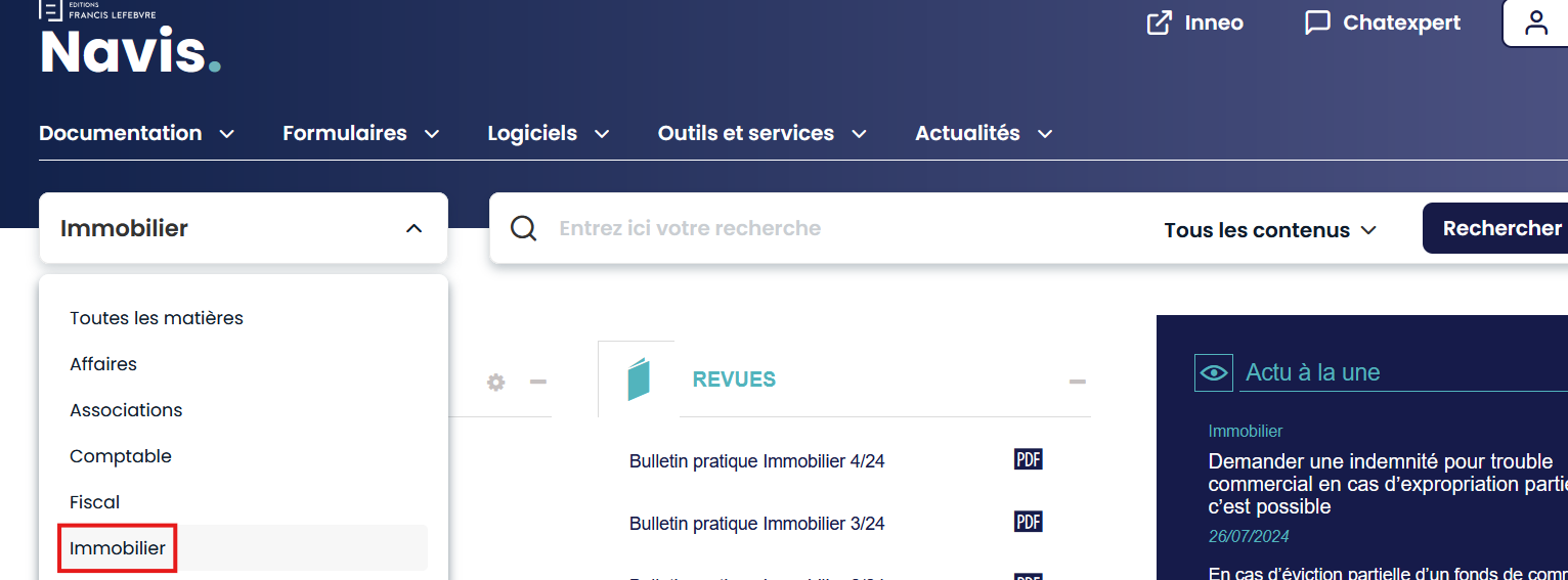 La page d’accueil de Navis Immobilier s’ouvre par défaut sur le contexte "Toutes les matières" du Portail Editions Francis Lefebvre. Pour limiter la recherche ou la consultation au seul domaine du droit immobilier, cliquer sur le lien "Toutes les matières" et sélectionner la matière souhaitée (sélecteur à gauche de la barre de recherche).