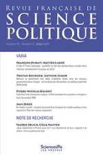 La Revue française de science politique couvre tous les domaines de la science politique (théorie politique, analyses institutionnelles, politiques publiques, sociologie électorales, relations internationales...) et analyse les questions politiques du monde contemporain.